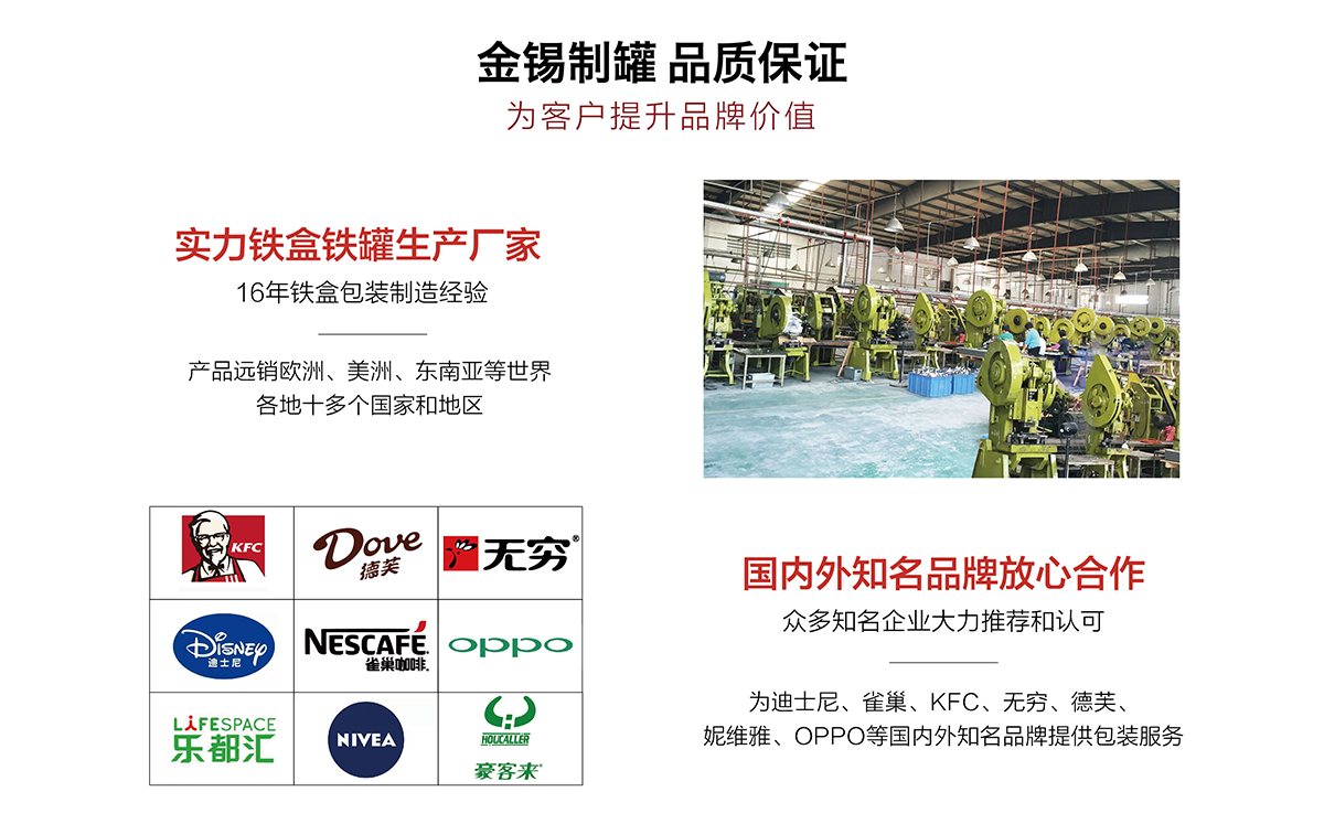 廣州市金錫五金制品有限公司成立于2016年,是已有13年生產(chǎn)經(jīng)驗(yàn)的實(shí)力廠家。我廠是專業(yè)定制優(yōu)良馬口鐵盒、鐵罐、禮品盒、茶葉罐、月餅盒等金屬鐵盒包裝的制罐企業(yè),我們擁有超過6000平方米的標(biāo)準(zhǔn)現(xiàn)代化廠房及八條生產(chǎn)線。公司集產(chǎn)品研發(fā)、設(shè)計、生產(chǎn)、銷售于一體,技術(shù)優(yōu)良,實(shí)力雄厚。通過十多年的制罐經(jīng)驗(yàn),我們擁有專業(yè)的技術(shù)團(tuán)隊,嚴(yán)格的作業(yè)流程、完整的品質(zhì)保障體系、完善的銷售以及售后服務(wù)系統(tǒng)。